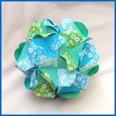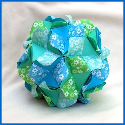 | The Sonobe unit never ceases to amaze. Here is yet another variation with curls, showing two views. | |