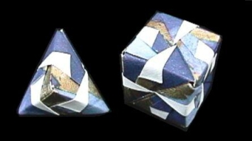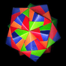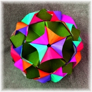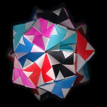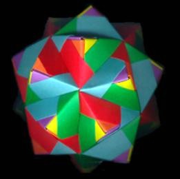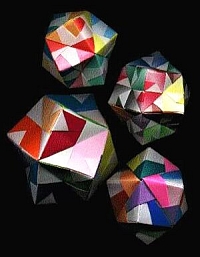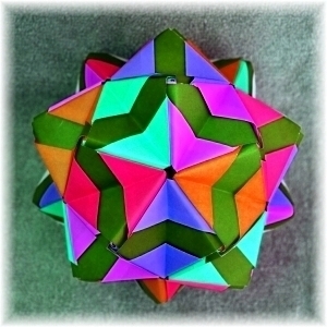 This gallery consists of own variations of Sonobe units.  The name Sonobe Unit comes from its creator Mitsunobu Sonobe who created the original one in the early 1970s.  Diagrams for the original Sonobe Unit can be found in Kasahara's book Origami for the Connoisseur and also on  Helena Verrill's website. Tomoko Fuse has created many Sonobe variations and some of these can be found in her book Unit Origami. A lot of Sonobes type units also be found in book Mette Units by Mette Pederson.  Some of my own variations displayed in this gallery could have been independently discovered by other folders who have played enough with Sonobe units. The the number of polyhedra that one can construct with Sonobe units is virtually endless. You can make a hexahedron (Toshie's Jewel) with 3 units, a cube with 6 or 12 units, a stellated octahedron with 12 units, a stellated icosahedron with 30 units, a stellated dodecahedron 90 units and so on. The maximum number of units that I have used in one Snobe polyhedron is 90. Here is a picture of a 900-unit model folded by Rosa Sanchez. One can also construct irregular polyhedra and other objects such as wreaths, birds etc.  |